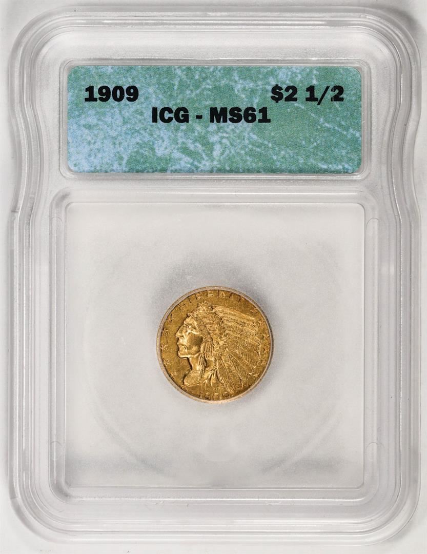 One 1909 $2 1/2 Indian Head Quarter Eagle Gold Coin ICG MS61. ICG Certified.