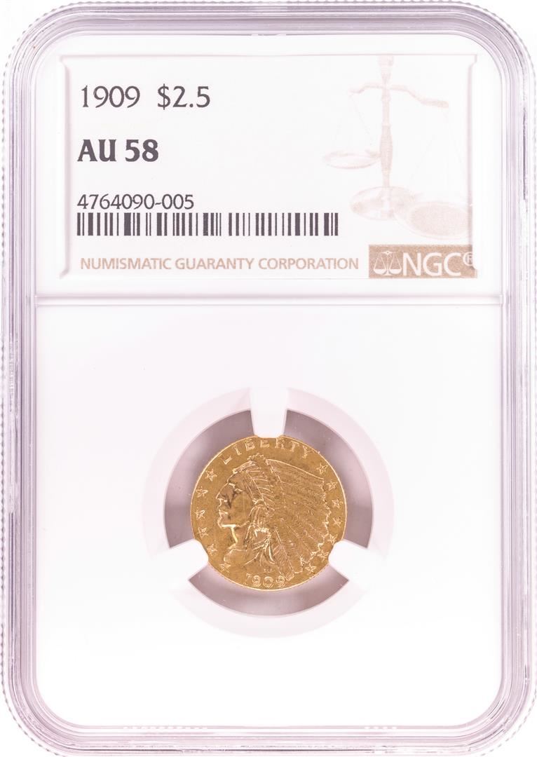 One 1909 $2 1/2 Indian Head Quarter Eagle Gold Coin NGC AU58. NGC Certified.