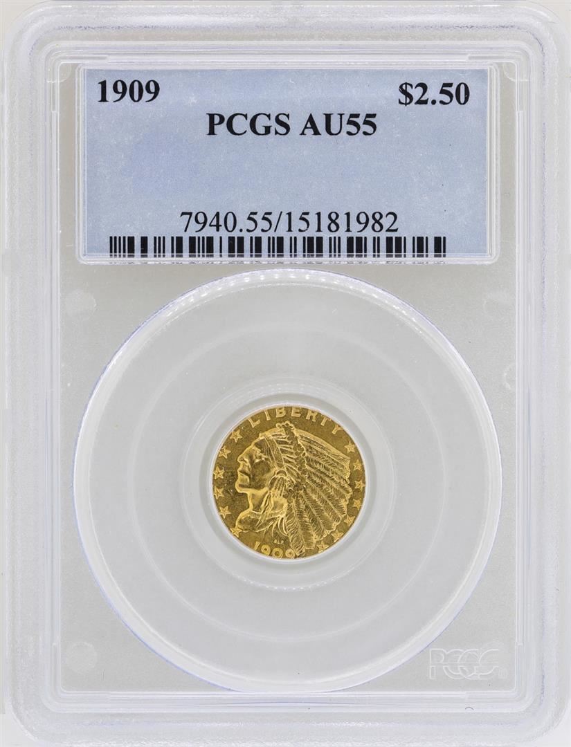 One 1909 $2 1/2 Indian Head Quarter Eagle Gold Coin PCGS AU55. PCGS Graded.