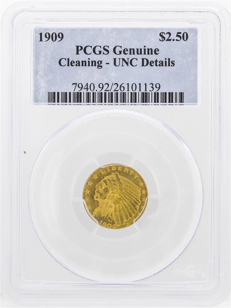 One 1909 $2 1/2 Indian Head Quarter Eagle Gold Coin PCGS Genuine UNC Details. PCGS Graded.