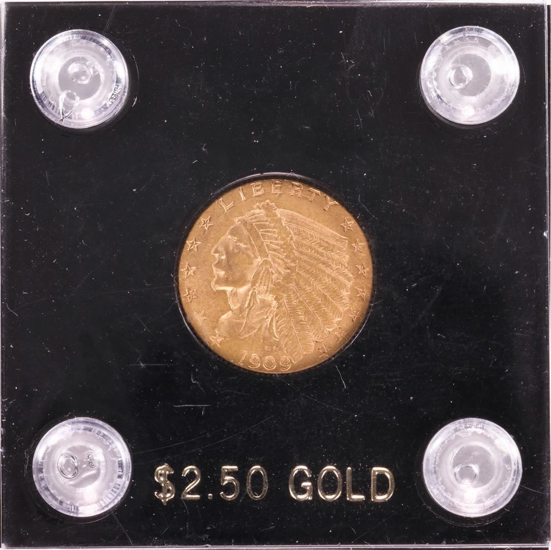 One 1909 $2 1/2 Indian Head Quarter Eagle Gold Coin.