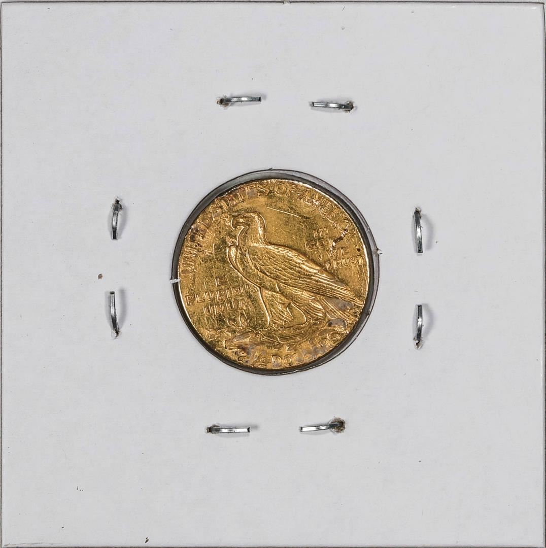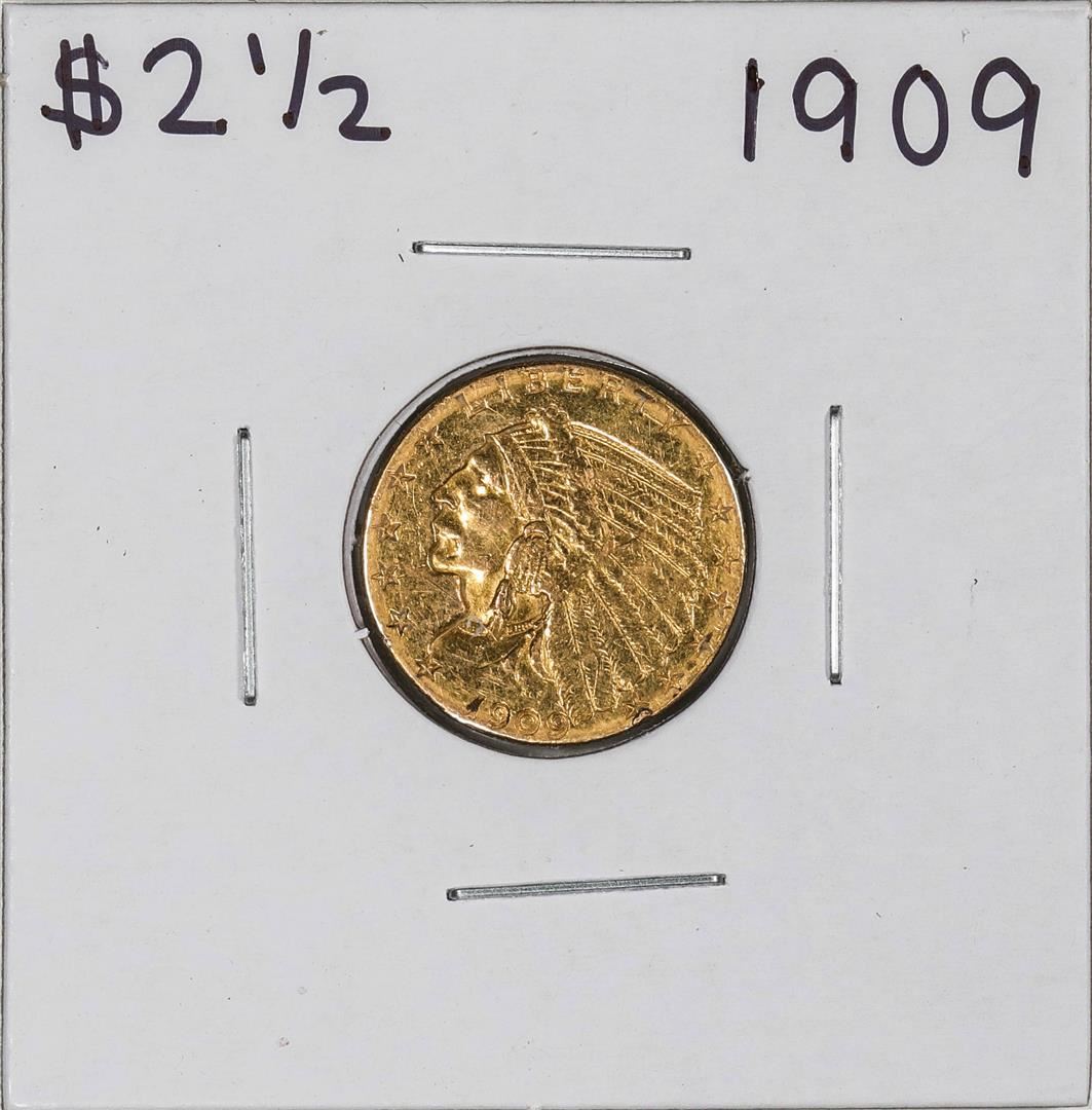 One 1909 $2 1/2 Indian Head Quarter Eagle Gold Coin, please note there is some damage to the coin as shown in the pictures.