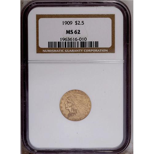 <B>1909 $2 1/2 MS62 NGC.</B></I> An unusual matte-like texture is seen on the surfaces of this second-year Indian quarter eagle. Seemingly high-end for the grade, with no major distractions.