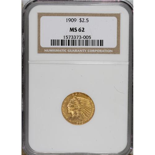 <B>1909 $2 1/2 MS62 NGC.</B></I> NGC Census: (1522/1347). PCGS Population (672/1150). Mintage: 441,700. Numismedia Wsl. Price: $575. (#7940)<BR><BR><b>Shipping:</b> Coins & Currency (<a target="_blank" href="http://www.heritageauctions.com/common/shipping.php">view shipping information</a>)