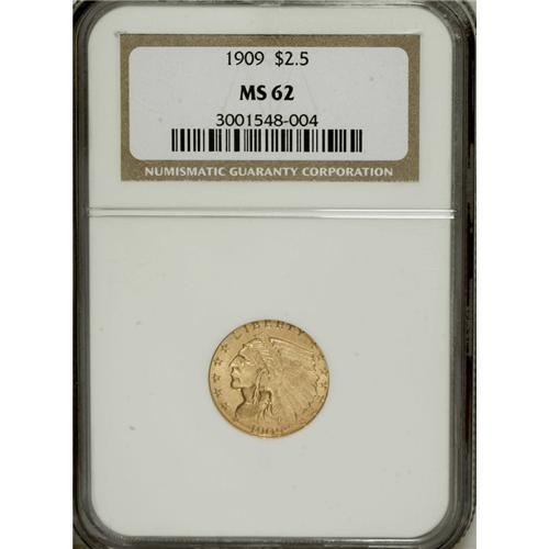 <B>1909 $2 1/2 MS62 NGC.</B></I> NGC Census: (1542/1360). PCGS Population (667/1153). Mintage: 441,700. Numismedia Wsl. Price for NGC/PCGS coin in MS62: $575. (#7940)<BR><BR><b>Shipping:</b> Coins & Currency (<a target="_blank" href="http://www.heritageauctions.com/common/shipping.php">view shipping information</a>)