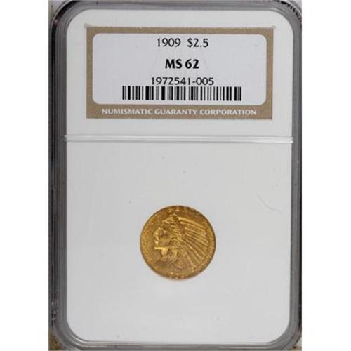 <B>1909 $2 1/2 MS62 NGC.</B></I> NGC Census: (1552/1384). PCGS Population (668/1152). Mintage: 441,700. Numismedia Wsl. Price for NGC/PCGS coin in MS62: $575. (#7940)<BR><BR><b>Shipping:</b> Coins & Currency (<a target="_blank" href="http://www.heritageauctions.com/common/shipping.php">view shipping information</a>)