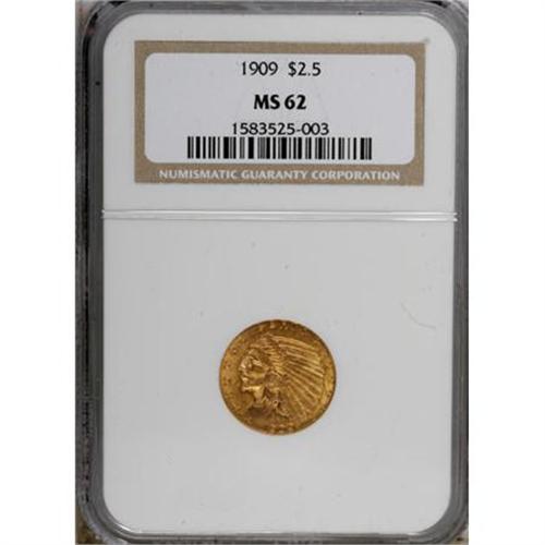 <B>1909 $2 1/2 MS62 NGC.</B></I> NGC Census: (1570/1406). PCGS Population (671/1186). Mintage: 441,700. Numismedia Wsl. Price for NGC/PCGS coin in MS62: $575. (#7940)<BR><BR><B>Coin Engraver:</B> Bela Lyon Pratt<BR><BR><b>Shipping:</b> Coins & Currency (<a target="_blank" href="http://www.heritageauctions.com/common/shipping.php">view shipping information</a>)