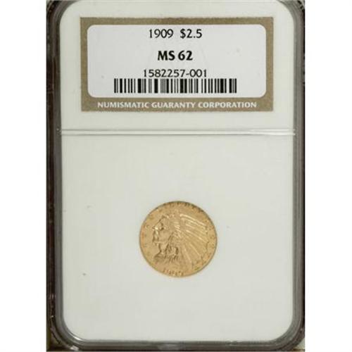 <B>1909 $2 1/2 MS62 NGC.</B></I> NGC Census: (1570/1406). PCGS Population (672/1186). Mintage: 441,700. Numismedia Wsl. Price for NGC/PCGS coin in MS62: $575. (#7940)<BR><BR><B>Coin Engraver:</B> Bela Lyon Pratt<BR><BR><b>Shipping:</b> Coins & Currency (<a target="_blank" href="http://www.heritageauctions.com/common/shipping.php">view shipping information</a>)