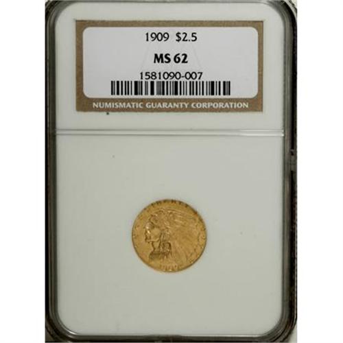 <B>1909 $2 1/2 MS62 NGC.</B></I> NGC Census: (1573/1416). PCGS Population (675/1197). Mintage: 441,700. Numismedia Wsl. Price for NGC/PCGS coin in MS62: $575. (#7940)<BR><BR><B>Coin Engraver:</B> Bela Lyon Pratt<BR><BR><b>Shipping:</b> Coins & Currency (<a target="_blank" href="http://www.heritageauctions.com/common/shipping.php">view shipping information</a>)