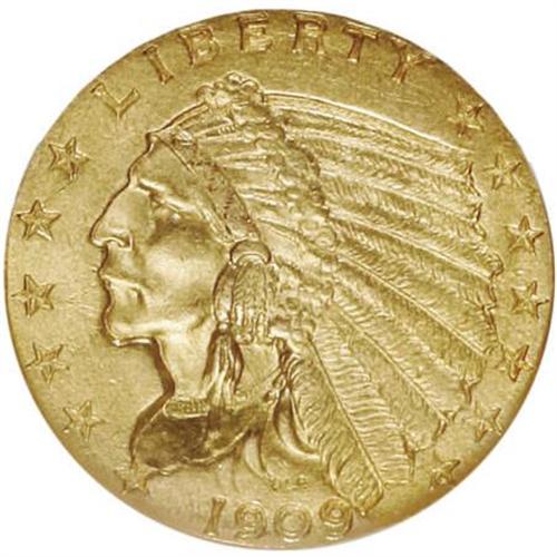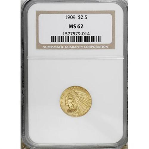 <B>1909 $2 1/2 MS62 NGC.</B></I> NGC Census: (1625/1436). PCGS Population (692/1218). Mintage: 441,700. Numismedia Wsl. Price for NGC/PCGS coin in MS62: $575. (#7940)<BR><BR><B>Coin Engraver:</B> Bela Lyon Pratt<BR><BR><b>Shipping:</b> Coins & Currency (<a target="_blank" href="http://www.heritageauctions.com/common/shipping.php">view shipping information</a>)