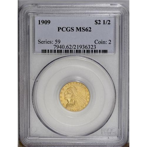 <B>1909<$2 1/2> MS62 PCGS.</B></I> Lightly abraded surfaces, as usual at this grade level, with lustrous yellow-gold coloration and tinges of blue. <BR><BR><B>Important notice:</B> Heritage usually auctions material at the rate of 200-250 lots per hour. On some occasions eBay Live bid software or the Internet may not be able to keep up with the pace of the auction. We recommend placing a realistic absentee bid now as insurance to avoid disappointment. Occasionally the auctioneer may eliminate or reject an eBay Live bid, and the auctioneer may also reopen a lot after the close of the eBay live bidding (usually because we missed an audience bid), and may reject your bid even if it shows you as the winning bidder. By bidding via eBay Live, you agree that Heritage may award the lot to another bidder at its sole discretion under the circumstances described above or any other reasonable circumstances. Since eBay bids are not shown to us until we open the lot on the floor, we treat those bids just like floor bids. In most cases the floor responds before the eBay bid is presented to us, due to Internet lag time, so for consistency we have made it a policy that floor bids are always considered first over tie eBay live bids. Also please note that all Heritage lots purchased through eBay Live carry a 20% Buyer's Premium. Please make sure you read the Terms and Conditions before you bid. This lot is being auctioned in conjunction with a live floor auction by Heritage Galleries & Auctioneers. All final auction and invoice information will be supplied by Heritage Galleries & Auctioneers, and all other information should be considered preliminary. Lot:2469 <BR><BR><B>Winning Notification and Billing:</B> After the FINAL session in this auction is complete, Heritage will send e-mail and snail mail invoices. This process normally takes several days. All final auction and invoice information will be supplied by Heritage Galleries & Auctioneers, and all other information should be considered preliminary. <BR><BR>This auction will be conducted on a live auction floor and over the Internet through eBay Live. If you choose to place an absentee bid, please take a moment to <font color='#0000ff'><u><a href='http://pages.ebay.com/liveauctions/help/before/laabsentee.html'>learn how eBay Live absentee bidding works</a></u></font><font color='#000000'>