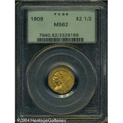 1909 $2 1/2 MS62 PCGS. Pleasing pumpkin-orange pat <B>1909 $2 1/2 MS62 PCGS.</B></I> Pleasing pumpkin-orange patina with subtle greenish-gray accents. The design features are well struck, except for the hair over the Indian's forehead. A minute linear abrasion is noted on the Indian's cheek and adjacent left obverse field. <BR><BR><B>Important notice:</B> Heritage usually auctions material at the rate of 200-250 lots per hour. On some occasions eBay Live bid software or the Internet may not be able to keep up with the pace of the auction. We recommend placing a realistic absentee bid now as insurance to avoid disappointment. Occasionally the auctioneer may eliminate or reject an eBay Live bid, and the auctioneer may also reopen a lot after the close of the eBay live bidding (usually because we missed an audience bid), and may reject your bid even if it shows you as the winning bidder. By bidding via eBay Live, you agree that Heritage may award the lot to another bidder at its sole discretion under the circumstances described above or any other reasonable circumstances. Since eBay bids are not shown to us until we open the lot on the floor, we treat those bids just like floor bids. In most cases the floor responds before the eBay bid is presented to us, due to Internet lag time, so for consistency we have made it a policy that floor bids are always considered first over tie eBay live bids. Also please note that all Heritage lots purchased through eBay Live carry a 20% Buyer's Premium. Please make sure you read the Terms and Conditions before you bid. This lot is being auctioned in conjunction with a live floor auction by Heritage Galleries & Auctioneers. All final auction and invoice information will be supplied by Heritage Galleries & Auctioneers, and all other information should be considered preliminary. Lot:6538