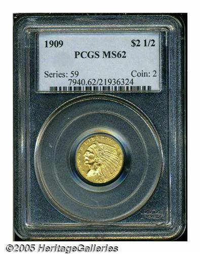 <B>1909<$2 1/2> MS62 PCGS.</B></I> Satiny and lustrous with pleasing pale yellow surfaces. This is a splendid example for the date or type collector.
