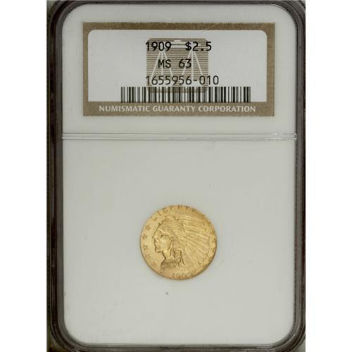 <B>1909 $2 1/2 MS63 NGC.</B></I> Canary-gold with hints of orange in the lustrous fields. The strike is above-average, and the few marks present on the surfaces are small and isolated.<BR><BR><b>Shipping:</b> Coin/Currency (<a target="_blank" href="http://www.heritageauctions.com/common/shipping.php">view shipping information</a>)