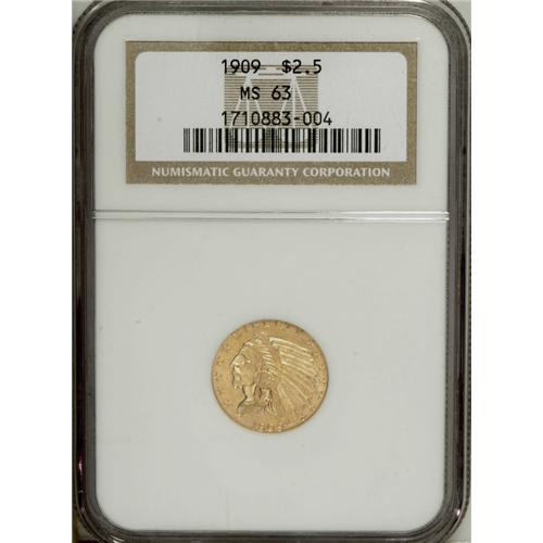 <B>1909 $2 1/2 MS63 NGC.</B></I> Peach-gold surfaces display traces of light green and nice luster, and are rather well preserved for the grade. A typical strike occurs on the design features. A nice looking coin throughout.<BR><BR><b>Shipping:</b> Coin/Currency (<a target="_blank" href="http://www.heritageauctions.com/common/shipping.php">view shipping information</a>)
