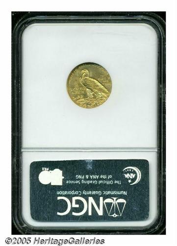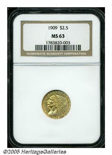 <B>1909<$2 1/2> MS63 NGC.</B></I> Very clean surfaces for an Indian quarter eagle. Light yellow-gold color and fully struck in all areas.
