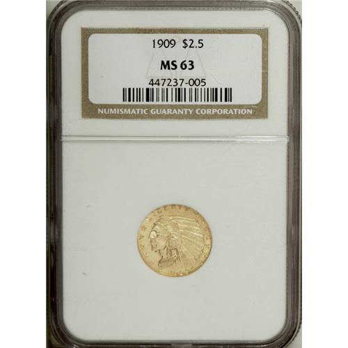 <B>1909 $2 1/2 MS63 NGC.</B></I> Well struck with bright, slightly brassy surfaces. A handful of ticks on the Indian's face and in the reverse fields account for the grade.<BR><BR><b>Shipping:</b> Coin/Currency (<a target="_blank" href="http://www.heritageauctions.com/common/shipping.php">view shipping information</a>)
