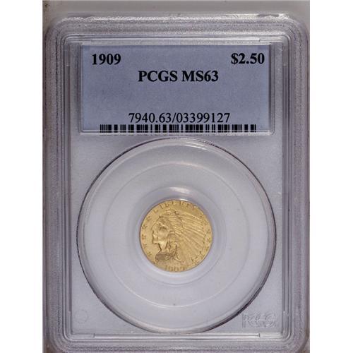 1909 $2 1/2 MS63 PCGS. Boldly struck and satiny, with