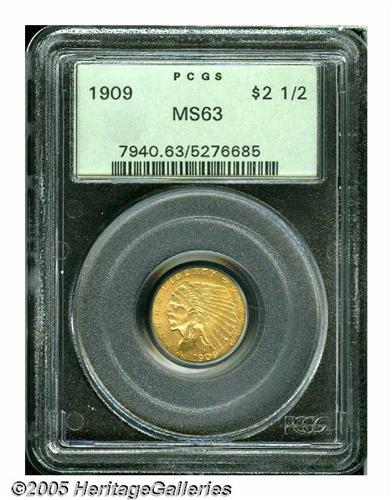 <B>1909<$2 1/2> MS63 PCGS.</B></I> Boldly struck with unusually deep red-orange and green coloration, satin luster, and a few tiny marks in the upper reverse fields. A visually pleasing example.