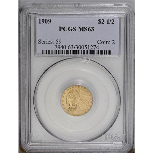 <B>1909<$2 1/2> MS63 PCGS.</B></I> High-end for the Select grade with soft golden color and the slightest evidence of contact. The strike is also notable as all of the device detail is intricately displayed. <BR><BR><B>Important notice:</B> Heritage usually auctions material at the rate of 200-250 lots per hour. On some occasions eBay Live bid software or the Internet may not be able to keep up with the pace of the auction. We recommend placing a realistic absentee bid now as insurance to avoid disappointment. Occasionally the auctioneer may eliminate or reject an eBay Live bid, and the auctioneer may also reopen a lot after the close of the eBay live bidding (usually because we missed an audience bid), and may reject your bid even if it shows you as the winning bidder. By bidding via eBay Live, you agree that Heritage may award the lot to another bidder at its sole discretion under the circumstances described above or any other reasonable circumstances. Since eBay bids are not shown to us until we open the lot on the floor, we treat those bids just like floor bids. In most cases the floor responds before the eBay bid is presented to us, due to Internet lag time, so for consistency we have made it a policy that floor bids are always considered first over tie eBay live bids. Also please note that all Heritage lots purchased through eBay Live carry a 20% Buyer's Premium. Please make sure you read the Terms and Conditions before you bid. This lot is being auctioned in conjunction with a live floor auction by Heritage Galleries & Auctioneers. All final auction and invoice information will be supplied by Heritage Galleries & Auctioneers, and all other information should be considered preliminary. Lot:2470 <BR><BR><B>Winning Notification and Billing:</B> After the FINAL session in this auction is complete, Heritage will send e-mail and snail mail invoices. This process normally takes several days. All final auction and invoice information will be supplied by Heritage Galleries & Auctioneers, and all other information should be considered preliminary. <BR><BR>This auction will be conducted on a live auction floor and over the Internet through eBay Live. If you choose to place an absentee bid, please take a moment to <font color='#0000ff'><u><a href='http://pages.ebay.com/liveauctions/help/before/laabsentee.html'>learn how eBay Live absentee bidding works</a></u></font><font color='#000000'>