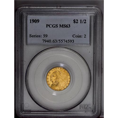 <B>1909 $2 1/2 MS63 PCGS.</B></I> Well struck and highly lustrous, with lovely even coloration and a minimal number of tiny contact marks, for the grade. A high-end MS63 example of this second-year issue in the series.