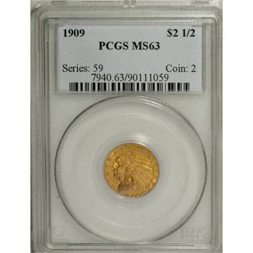 <B>1909 $2 1/2 MS63 PCGS.</B></I> Rich-orange-gold patination is displays splashes of gray-green, and rests over highly lustrous surfaces. The design features are well impressed.<BR><BR><B>Coin Engraver:</B> Bela Lyon Pratt<BR><BR><b>Shipping:</b> Coins & Currency (<a target="_blank" href="http://www.heritageauctions.com/common/shipping.php">view shipping information</a>\)