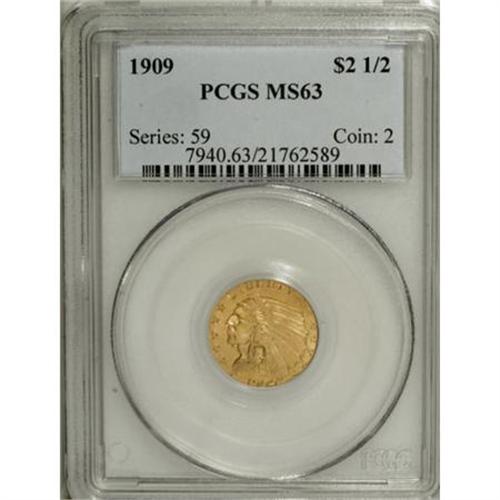 <B>1909 $2 1/2 MS63 PCGS.</B></I> Boldly struck with smooth, satiny luster and only a handful of faint abrasions. This early Indian quarter eagle has luminous surfaces that offer pleasing yellow-orange color with hints of amber.<BR><BR><B>Coin Engraver:</B> Bela Lyon Pratt<BR><BR><b>Shipping:</b> Coins & Currency (<a target="_blank" href="http://www.heritageauctions.com/common/shipping.php">view shipping information</a>\)