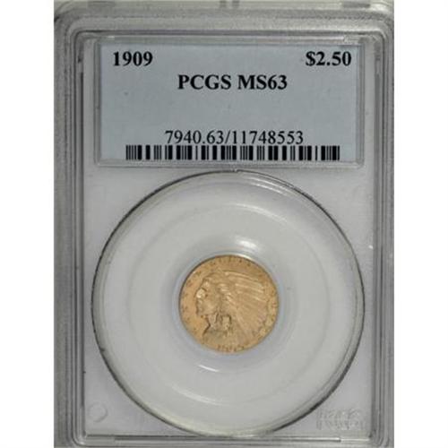 <B>1909 $2 1/2 MS63 PCGS.</B></I> Greenish-gold patina rests on lustrous surfaces, and a boldly executed strike brings out excellent definition on the portrait. Wonderful eye appeal despite a few faint abrasions near the devices.<BR><BR><B>Coin Engraver:</B> Bela Lyon Pratt<BR><BR><b>Shipping:</b> Coins & Currency (<a target="_blank" href="http://www.heritageauctions.com/common/shipping.php">view shipping information</a>)