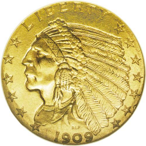 <B>1909<$2 1/2> MS64 NGC.</B></I> Attractive olive-orange coloration adorns satiny, matte-like surfaces. The centers are a bit weak, but both sides are pleasingly preserved. A couple of trivial marks are noted in the upper right reverse field. The 1909 quarter eagle, with a mintage of 441,760 pieces, is not scarce as a near-Gem but becomes scarce at or above the Gem level of preservation.