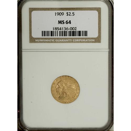 <B>1909 $2 1/2 MS64 NGC.</B></I> Fully lustrous yellow-gold surfaces and sharp design motifs characterize this lovely near-Gem example. This issue is usually available in most grades through the Gem level. An excellent type coin, although not nearly as plentiful as the dates from 1925 to 1929.<BR><BR><b>Shipping:</b> Coins & Currency (<a target="_blank" href="http://www.heritageauctions.com/common/shipping.php">view shipping information</a>)