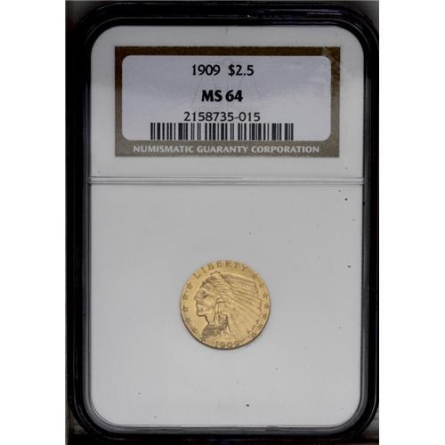 <B>1909<$2 1/2> MS64 NGC.</B></I> Mellow hues of honey-golden color accent both sides of this near-Gem. The luster is slightly subdued, the primary grade-limiting factor. Finer states of preservation for this date can be prohibitively scarce and quite expensive. <BR><BR><B>Important notice:</B> Heritage usually auctions material at the rate of 200-250 lots per hour. On some occasions eBay Live bid software or the Internet may not be able to keep up with the pace of the auction. We recommend placing a realistic absentee bid now as insurance to avoid disappointment. Occasionally the auctioneer may eliminate or reject an eBay Live bid, and the auctioneer may also reopen a lot after the close of the eBay live bidding (usually because we missed an audience bid), and may reject your bid even if it shows you as the winning bidder. By bidding via eBay Live, you agree that Heritage may award the lot to another bidder at its sole discretion under the circumstances described above or any other reasonable circumstances. Since eBay bids are not shown to us until we open the lot on the floor, we treat those bids just like floor bids. In most cases the floor responds before the eBay bid is presented to us, due to Internet lag time, so for consistency we have made it a policy that floor bids are always considered first over tie eBay live bids. Also please note that all Heritage lots purchased through eBay Live carry a 20% Buyer's Premium. Please make sure you read the Terms and Conditions before you bid. This lot is being auctioned in conjunction with a live floor auction by Heritage Galleries & Auctioneers. All final auction and invoice information will be supplied by Heritage Galleries & Auctioneers, and all other information should be considered preliminary. Lot:2471 <BR><BR><B>Winning Notification and Billing:</B> After the FINAL session in this auction is complete, Heritage will send e-mail and snail mail invoices. This process normally takes several days. All final auction and invoice information will be supplied by Heritage Galleries & Auctioneers, and all other information should be considered preliminary. <BR><BR>This auction will be conducted on a live auction floor and over the Internet through eBay Live. If you choose to place an absentee bid, please take a moment to <font color='#0000ff'><u><a href='http://pages.ebay.com/liveauctions/help/before/laabsentee.html'>learn how eBay Live absentee bidding works</a></u></font><font color='#000000'>