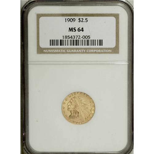 <B>1909 $2 1/2 MS64 NGC.</B></I> This Choice and lustrous representative has above-average detail. Parts of the yellow-gold reverse exhibit attractive peach overtones.<BR><BR><b>Shipping:</b> Coins & Currency (<a target="_blank" href="http://www.heritageauctions.com/common/shipping.php">view shipping information</a>)