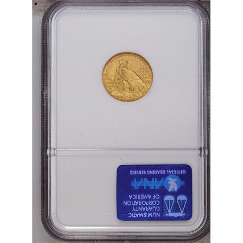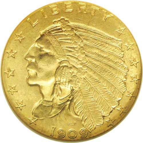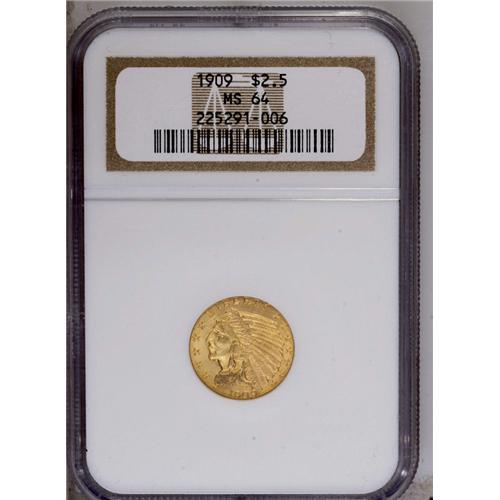<B>1909<$2 1/2> MS64 NGC.</B></I> This handsome near-Gem features shimmering yellow-peach and green-gold luster. Noticeable marks are absent, and the strike is uncommonly sharp, even on the sometimes mushy lower headdress feathers. The demand for early issues in the Indian quarter eagle series is higher than for their better-saved counterparts from the 1920s.