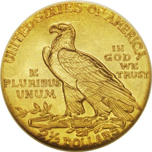 <B>1909 $2 1/2 MS64 NGC.</B></I> This near Gem is sharply struck, evidenced by nice definition on the headdress feathers and the eagle's shoulder feathers. Attractive luster is apparent beneath the thin layer of orange-gold coloration which is imbued with traces of grayish-green. The surfaces are well preserved, showing no significant abrasions. A few minor handling marks are visible in the open, exposed fields of the upper reverse.