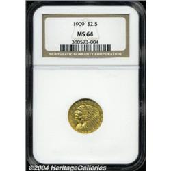 <B>1909<$2 1/2> MS64 NGC.</B></I> Lustrous and virtually unmarked with hard, satiny brilliance under delicate accents of olive and reddish-orange. One of the more challenging issues in this brief series in near-Gem condition. <BR><BR><B>Important notice:</B> Heritage usually auctions material at the rate of 200-250 lots per hour. On some occasions eBay Live bid software or the Internet may not be able to keep up with the pace of the auction. We recommend placing a realistic absentee bid now as insurance to avoid disappointment. Occasionally the auctioneer may eliminate or reject an eBay Live bid, and the auctioneer may also reopen a lot after the close of the eBay live bidding (usually because we missed an audience bid), and may reject your bid even if it shows you as the winning bidder. By bidding via eBay Live, you agree that Heritage may award the lot to another bidder at its sole discretion under the circumstances described above or any other reasonable circumstances. Since eBay bids are not shown to us until we open the lot on the floor, we treat those bids just like floor bids. In most cases the floor responds before the eBay bid is presented to us, due to Internet lag time, so for consistency we have made it a policy that floor bids are always considered first over tie eBay live bids. Also please note that all Heritage lots purchased through eBay Live carry a 20% Buyer's Premium. Please make sure you read the Terms and Conditions before you bid. </span></font></tr></table></td></tr></table>