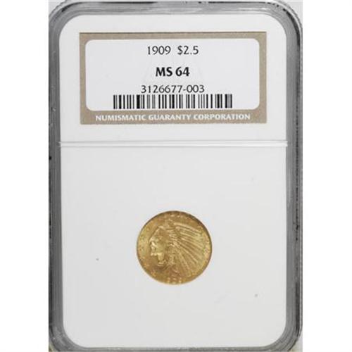 <B>1909 $2 1/2 MS64 NGC.</B></I> Traces of light-green tint the apricot-gold surfaces of this near-Gem quarter eagle, and a solid strike brings out excellent detail on the design elements. Some minor handling marks define the grade.<BR><BR><B>Coin Engraver:</B> Bela Lyon Pratt<BR><BR><b>Shipping:</b> Coins & Currency (<a target="_blank" href="http://www.heritageauctions.com/common/shipping.php">view shipping information</a>)