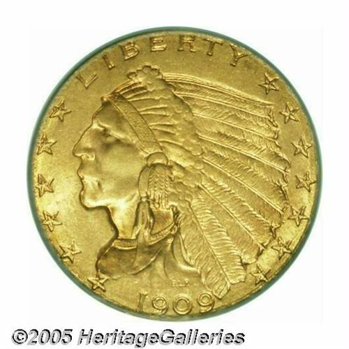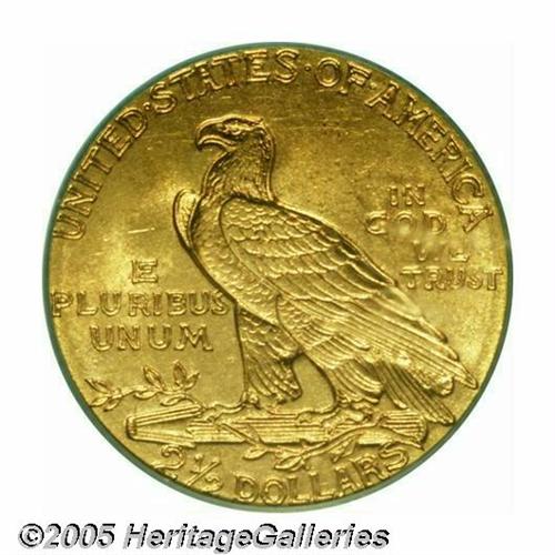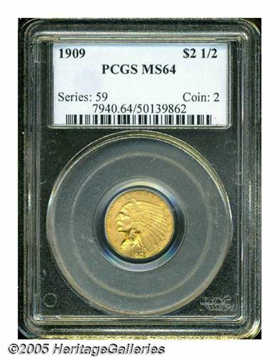 <B>1909<$2 1/2> MS64 PCGS.</B></I> A lovely example showing bold detail definition on the eagle's neck, wings, tail, and legs. Mostly brilliant surfaces with just a hint of violet on the highpoints of the obverse. Scarce and eagerly sought in MS64 and higher grades.