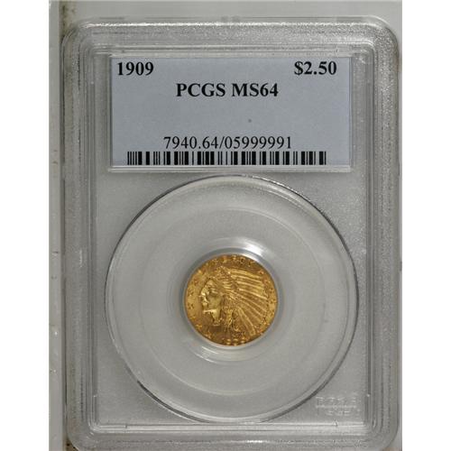 <B>1909 $2 1/2 MS64 PCGS.</B></I> A softly lustrous piece that has an above-average strike. The yellow-gold surfaces are largely clean, though a light graze is noted on the Indian's cheek.<BR><BR><b>Shipping:</b> Coin/Currency (<a target="_blank" href="http://www.heritageauctions.com/common/shipping.php">view shipping information</a>)