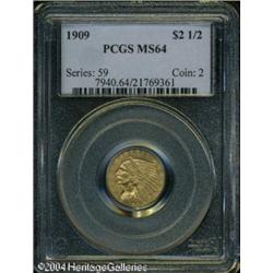 1909 $2 1/2 MS64 PCGS. Amazingly clean surfaces fo <B>1909 $2 1/2 MS64 PCGS.</B></I> Amazingly clean surfaces for an Indian quarter eagle. Light orange-gold color and well struck in all areas. <BR><BR><B>Important notice:</B> Heritage usually auctions material at the rate of 200-250 lots per hour. On some occasions eBay Live bid software or the Internet may not be able to keep up with the pace of the auction. We recommend placing a realistic absentee bid now as insurance to avoid disappointment. Occasionally the auctioneer may eliminate or reject an eBay Live bid, and the auctioneer may also reopen a lot after the close of the eBay live bidding (usually because we missed an audience bid), and may reject your bid even if it shows you as the winning bidder. By bidding via eBay Live, you agree that Heritage may award the lot to another bidder at its sole discretion under the circumstances described above or any other reasonable circumstances. Since eBay bids are not shown to us until we open the lot on the floor, we treat those bids just like floor bids. In most cases the floor responds before the eBay bid is presented to us, due to Internet lag time, so for consistency we have made it a policy that floor bids are always considered first over tie eBay live bids. Also please note that all Heritage lots purchased through eBay Live carry a 20% Buyer's Premium. Please make sure you read the Terms and Conditions before you bid. This lot is being auctioned in conjunction with a live floor auction by Heritage Galleries & Auctioneers. All final auction and invoice information will be supplied by Heritage Galleries & Auctioneers, and all other information should be considered preliminary. Lot:6543