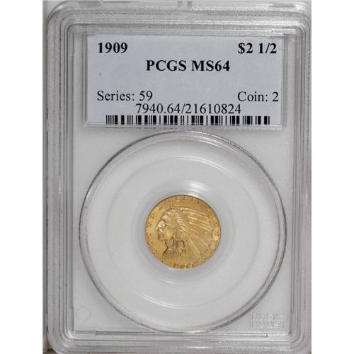 <B>1909 $2 1/2 MS64 PCGS.</B></I> The amber-gold surfaces of this solidly struck piece have strong orange accents. A couple of light abrasions are present in the left obverse field.<BR><BR><b>Shipping:</b> Coin/Currency (<a target="_blank" href="http://www.heritageauctions.com/common/shipping.php">view shipping information</a>)
