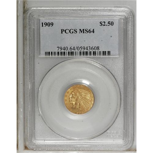 <B>1909 $2 1/2 MS64 PCGS.</B></I> The design elements are well defined, with excellent sharpness on the headdress feathers. The deep green-gold toning is imbued with accents of rose. In 1988, David Akers rated this issue as "Very Scarce, R-5" at the MS64 grade level.<BR><BR><b>Shipping:</b> Coins & Currency (<a target="_blank" href="http://www.heritageauctions.com/common/shipping.php">view shipping information</a>)