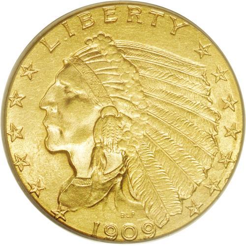 <B>1909<$2 1/2> MS64 PCGS.</B></I> The surfaces have soft, frosty luster with attractive green-gold coloration. Minor scrapes and faint scratches limit the grade of this early Indian quarter eagle. A pleasing near-Gem example with sharp design details.