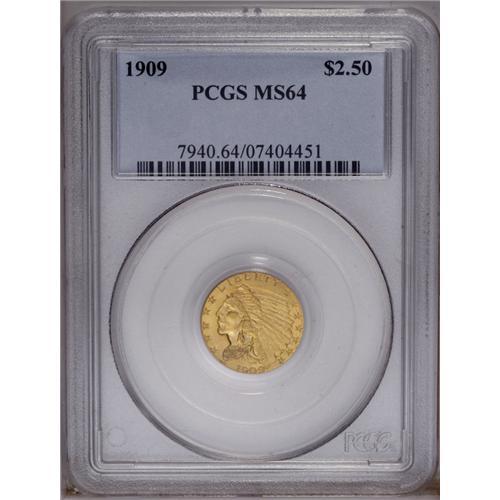 1909 $2 1/2 MS64 PCGS. The surfaces have soft, frosty 1909[$2 1/2] MS64 PCGS.