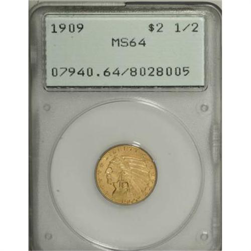 <B>1909 $2 1/2 MS64 PCGS.</B></I> A satiny near-Gem that has a penetrating strike and a well preserved obverse. A solitary hair-thin graze above the wing is all that prevents a finer grade. Certified in a first generation holder.<B><BR></B></I><I>From The Carlton Woods Collection.</B></I><BR><BR><B>Coin Engraver:</B> Bela Lyon Pratt<BR><BR><b>Shipping:</b> Coins & Currency (<a target="_blank" href="http://www.heritageauctions.com/common/shipping.php">view shipping information</a>\)