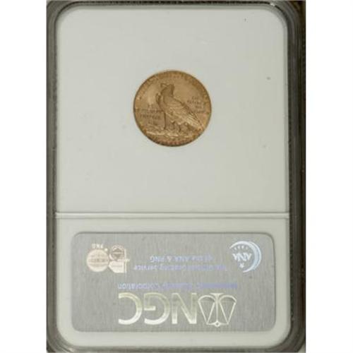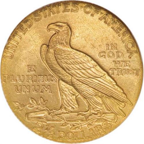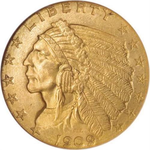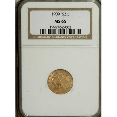 <B>1909 $2 1/2 MS65 NGC.</B></I> A peach-inflected orange-gold representative of this early Indian quarter eagle issue, solidly struck overall with excellent luster and strong overall visual appeal. The fields are pristine save for a handful of negligible flaws, and the devices appear likewise. An attractive example for the discerning date collector.<BR><BR><B>Coin Engraver:</B> Bela Lyon Pratt<BR><BR><b>Shipping:</b> Coins & Currency (<a target="_blank" href="http://www.heritageauctions.com/common/shipping.php">view shipping information</a>\)