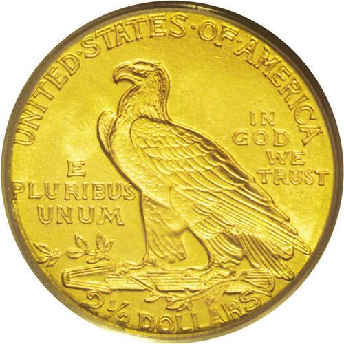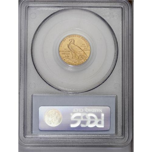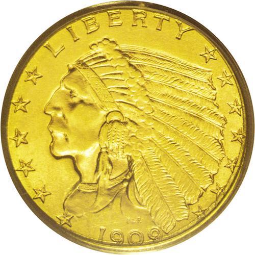 <B>1909<$2 1/2> MS65 PCGS.</B></I> A lovely Gem that is fully struck in all areas and exhibits a rich blending of honey-gold and reddish coloration. The surfaces resemble the rare Roman Gold proofs of this year. For accuracy alone, we call attention to a thin streak of die polish (as struck) near the left obverse rim that extends between stars 4 and 5, passing beneath the former. A plentiful issue in the lower Mint State grades, Gem examples of this quarter eagle are not available in any appreciable quantity and are highly favored by advanced type collectors.