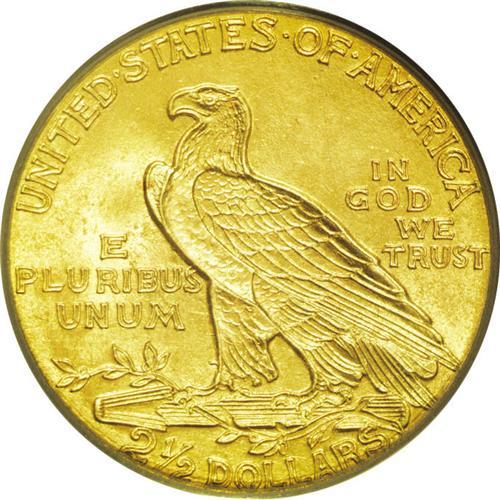 <B>1909<$2 1/2> MS65 PCGS.</B></I> A nice-looking Gem specimen, with khaki-gold highpoints and green-gold tinges on the incuse design. Scrutiny with a loupe reveals surfaces that are virtually free of distracting abrasions, mattelike surfaces that are absolutely devoid of luster breaks, and enormous eye appeal. PCGS has graded 16 pieces finer (9/06).