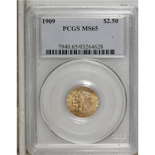 <B>1909 $2 1/2 MS65 PCGS.</B></I> At a distance, the color of this coin is more reminiscent of a copper-nickel cent than of a gold coin, with light brown predominating against an olive background. The luster is intact and satiny, the strike is sharp, and the exposed surfaces have a minimum of intrusive marks.<BR><BR><b>Shipping:</b> Coins & Currency (<a target="_blank" href="http://www.heritageauctions.com/common/shipping.php">view shipping information</a>)