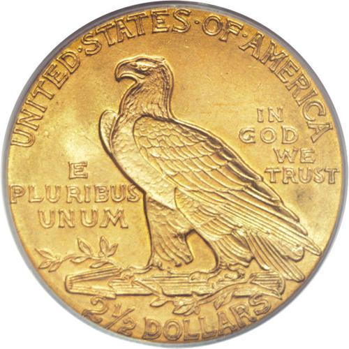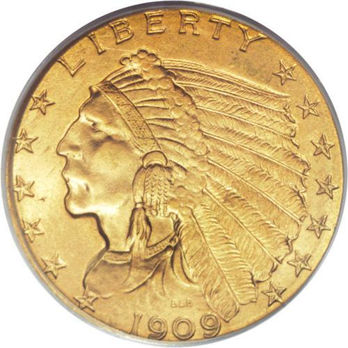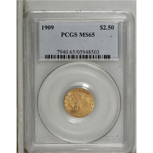 <B>1909 $2 1/2 MS65 PCGS.</B></I> Khaki-gold surfaces have a somewhat grainy luster, resembling the matte proof examples to a certain degree. A well executed strike makes itself known on the design elements, where sharp definition is seen on the bonnet feathers and on those of the eagle. A couple of minor luster grazes occur on the reverse.<BR><BR><b>Shipping:</b> Coins & Currency (<a target="_blank" href="http://www.heritageauctions.com/common/shipping.php">view shipping information</a>)