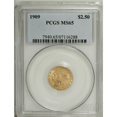 <B>1909 $2 1/2 MS65 PCGS.</B></I> This is a sensational Gem example that represents one of several condition rarities in the Indian Head quarter eagle series. This frosty example has lovely honey-gold color with hints of pale pink toning on each side. A quality example that is seldom exceeded. PCGS has only certified 16 finer examples of this date (1/07).<BR><BR><b>Shipping:</b> Coins & Currency (<a target="_blank" href="http://www.heritageauctions.com/common/shipping.php">view shipping information</a>)